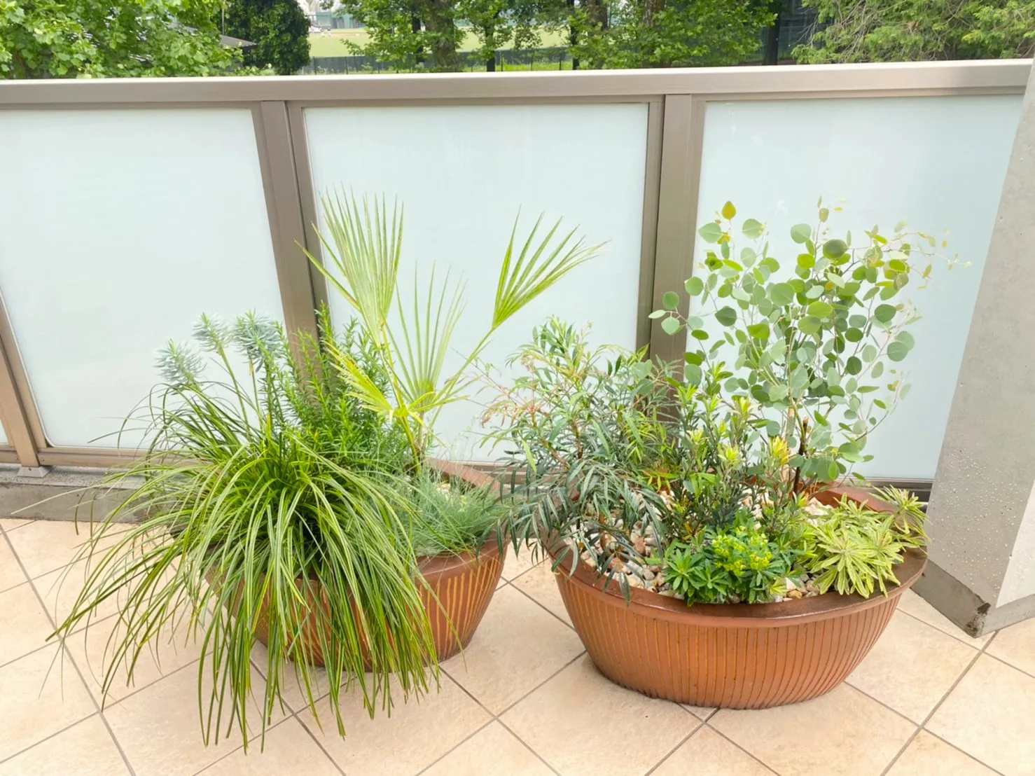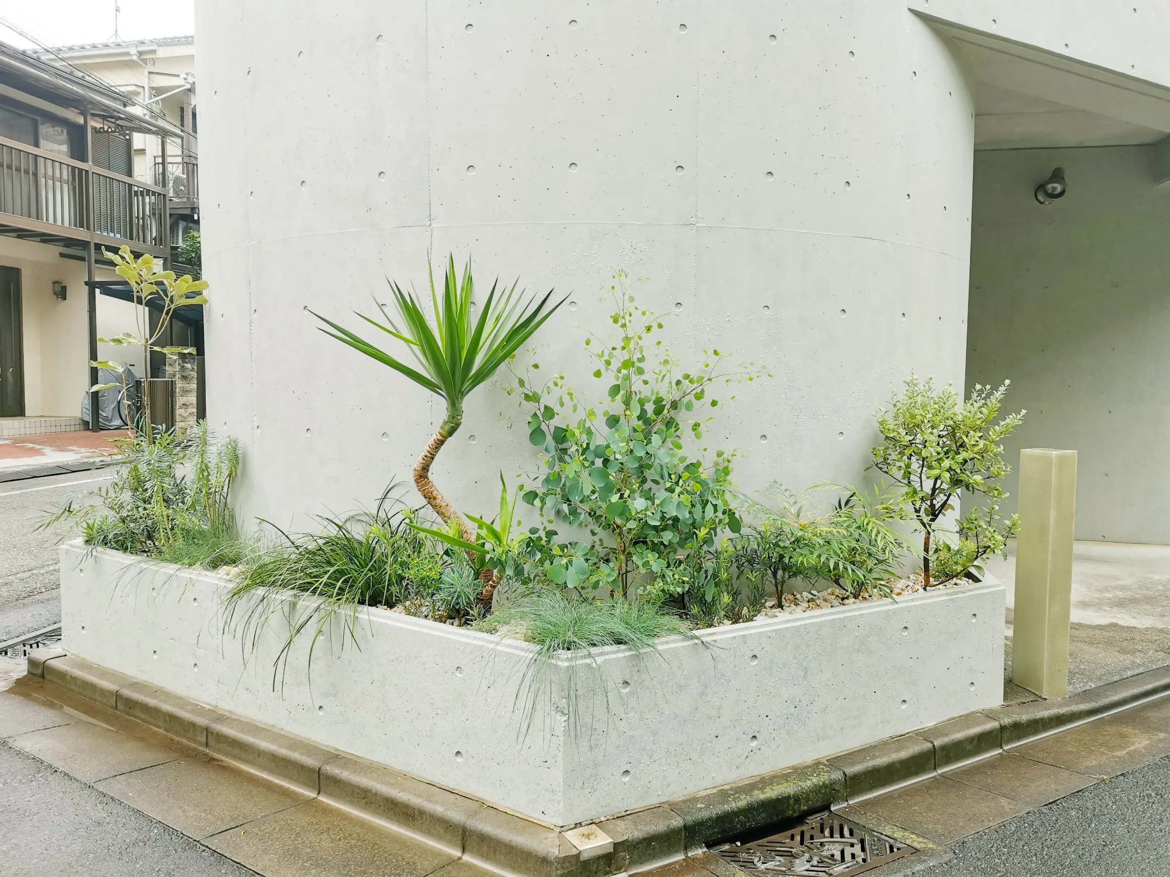 建物に沿って配された植栽スペースとテラスのプランターの植え替えを行いました。水やりや落ち葉の掃除など日々のお世話をできるだけ楽にしたい、という施主様のご希望をもとに、比較的乾燥に強く葉が落ちにくい植物をご用意。植物と植物の間隔に余裕を持たせて配置することである程度成長しても見栄えを維持しやすく、また剪定などのお手入れのしやすさも確保しました。