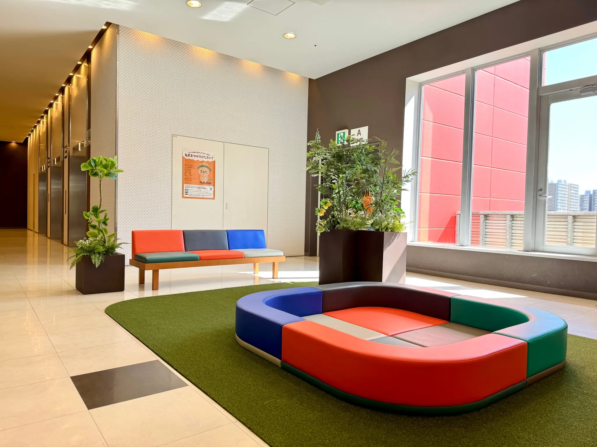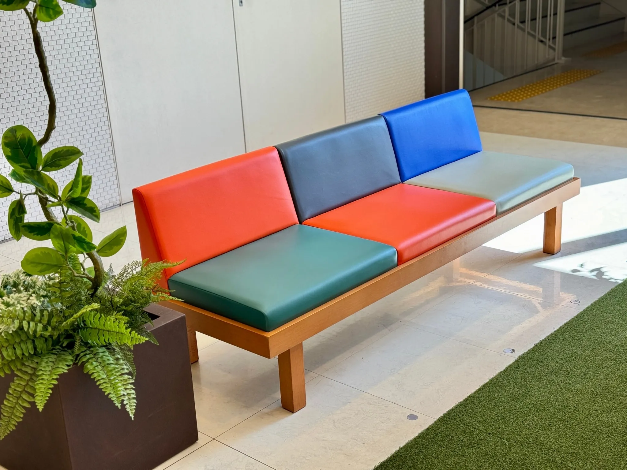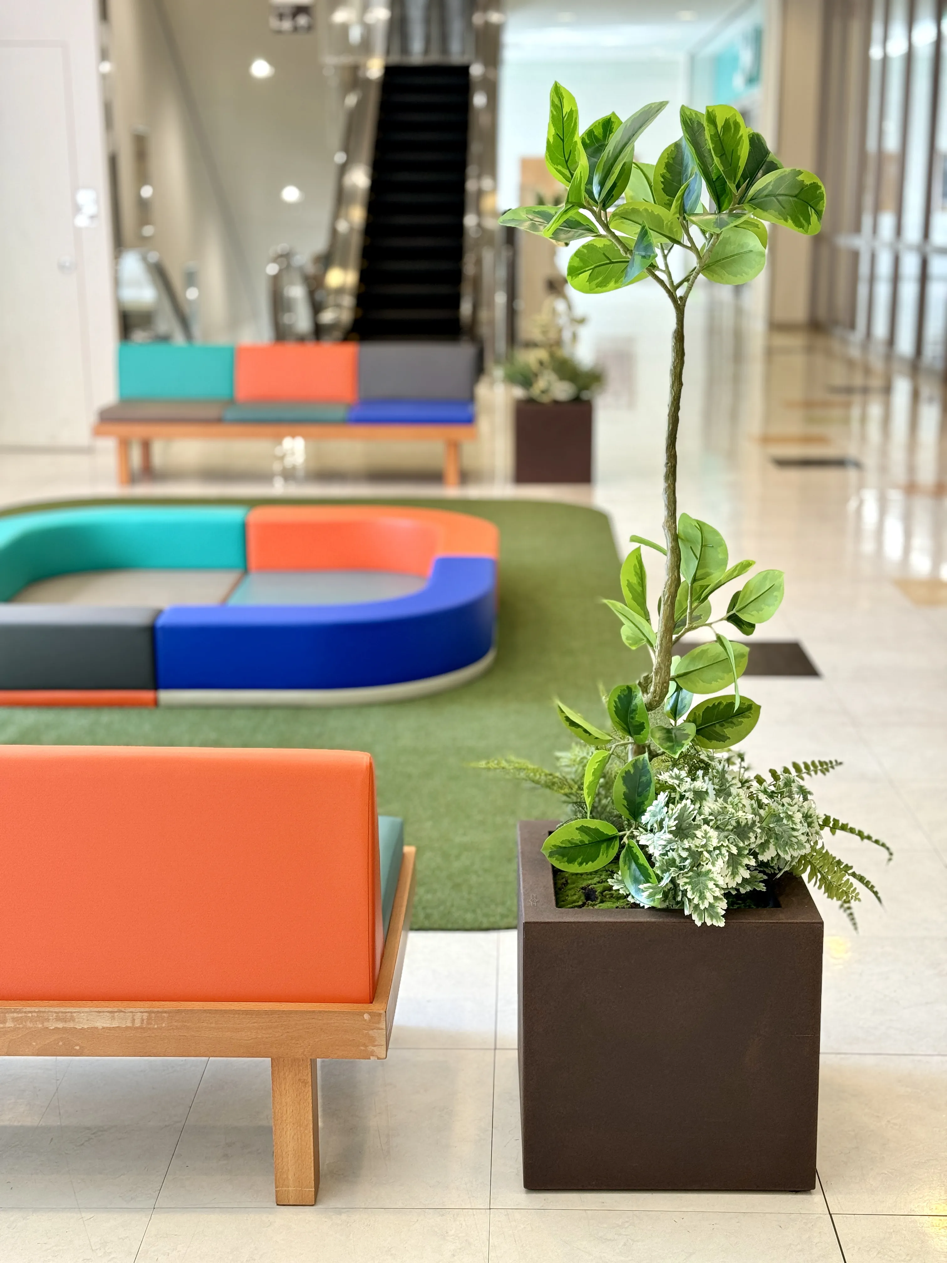 大井競馬場前ショッピングセンター「ウィラ大井」の共有部のリニューアル環境演出をヒキダシ|GREEN COMPANYが担当いたしました。リニューアル前の共有部にあったソファやチェアなどの什器は長い年月の使用によって傷みや汚れがついていたものの構造的には問題なく、手を加えてきれいにすればまだまだ使えるものでした。そこで私たちは、「今ある資源を創意工夫工で魅力ある新たなものに」という考えのもと、既存の什器を最大限活用することを軸に環境演出を計画しました。それは、持続可能な社会の実現に貢献することを重視する施主の経営姿勢とリンクする考えでもありました。