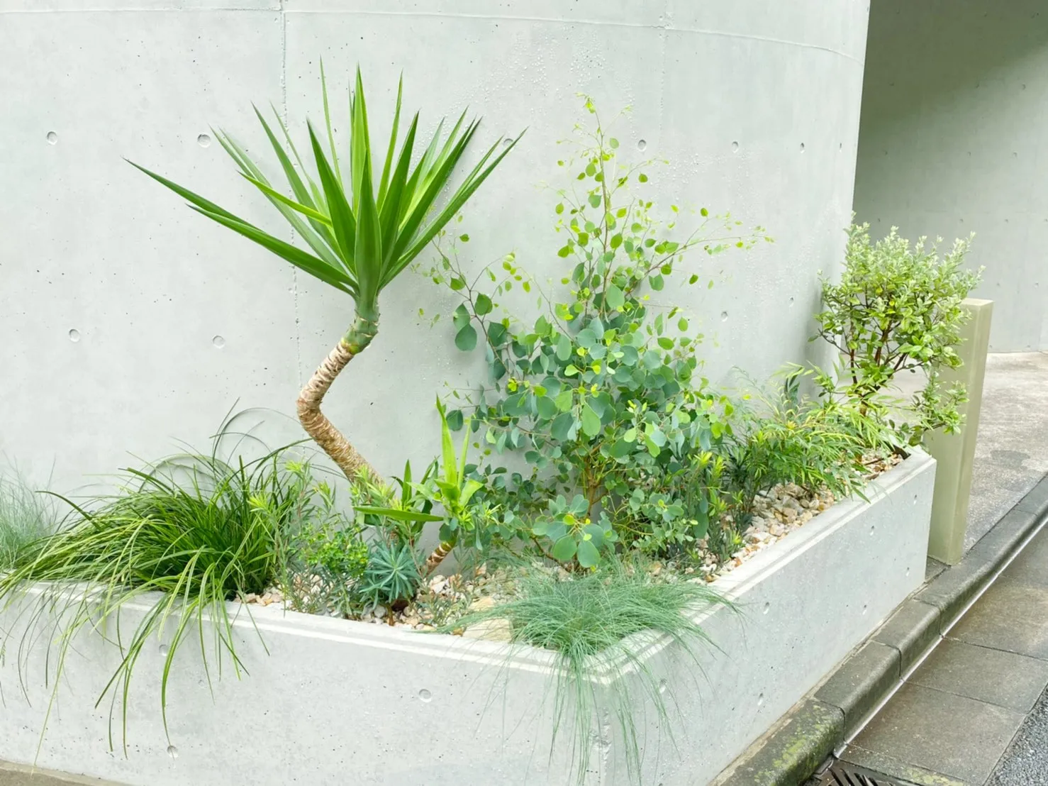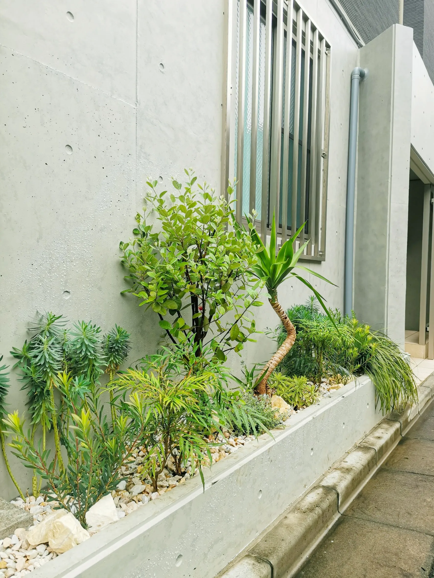 建物に沿って配された植栽スペースとテラスのプランターの植え替えを行いました。水やりや落ち葉の掃除など日々のお世話をできるだけ楽にしたい、という施主様のご希望をもとに、比較的乾燥に強く葉が落ちにくい植物をご用意。植物と植物の間隔に余裕を持たせて配置することである程度成長しても見栄えを維持しやすく、また剪定などのお手入れのしやすさも確保しました。