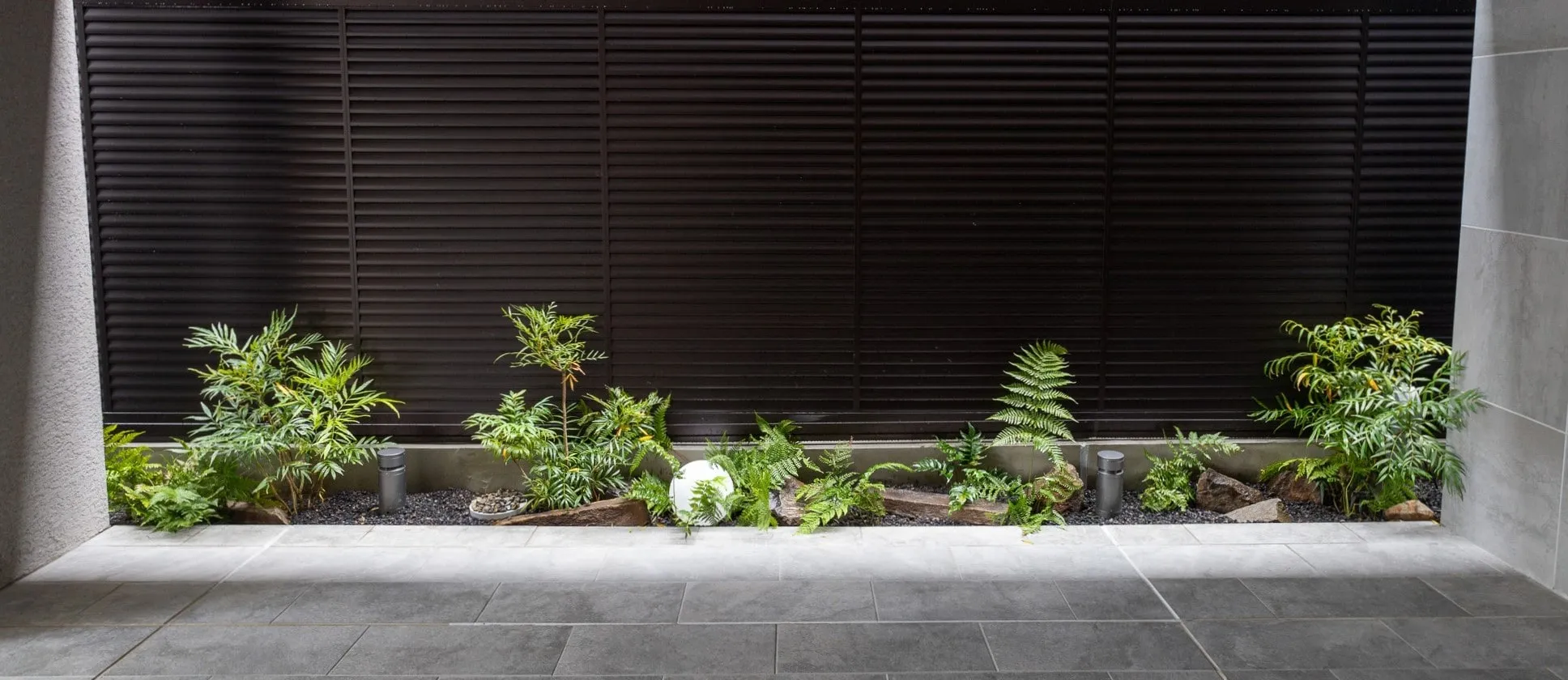 日陰の環境のため、耐陰性のある樹種を選定。景石を多めに配することで、ロックガーデン風に。