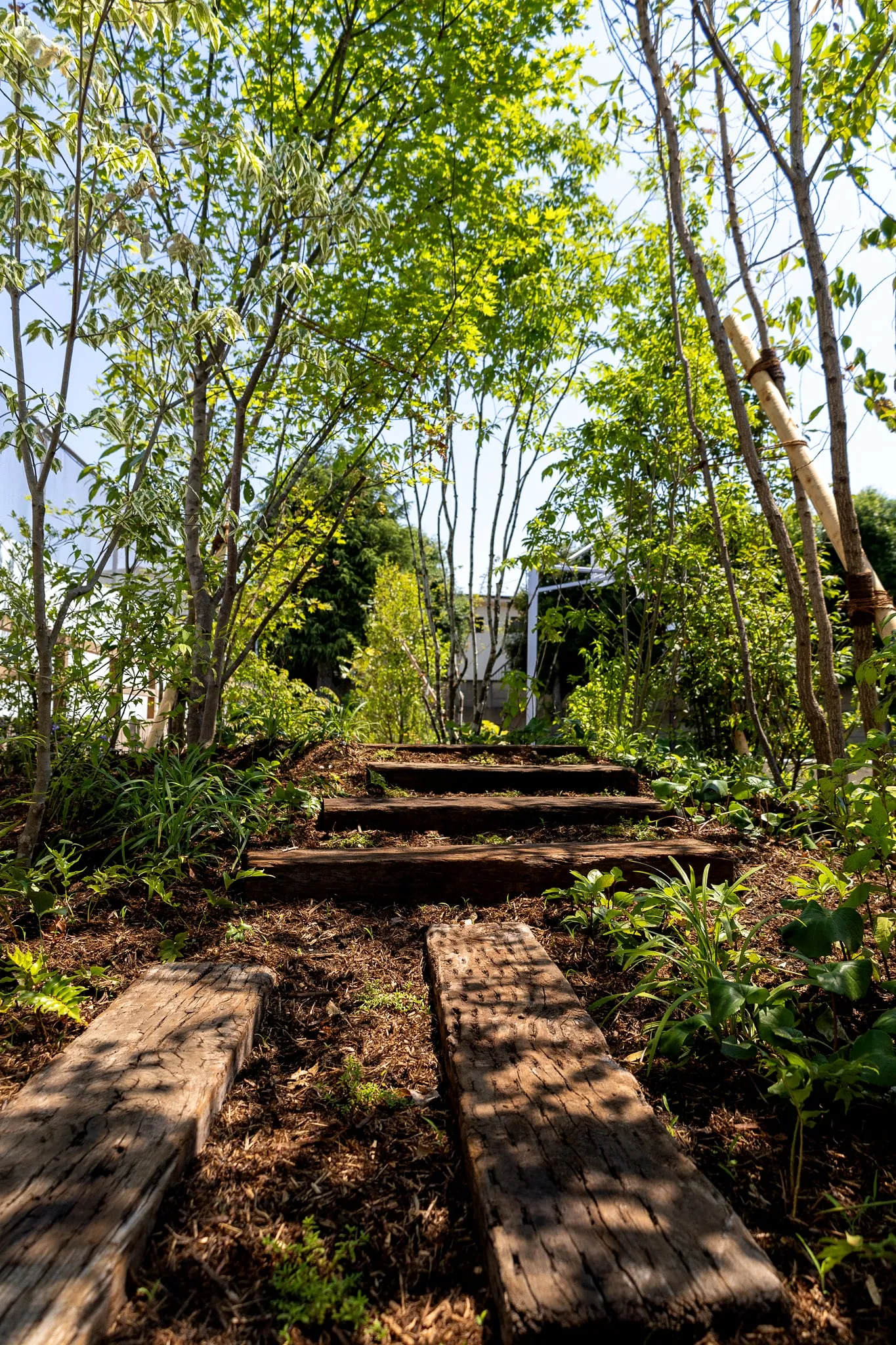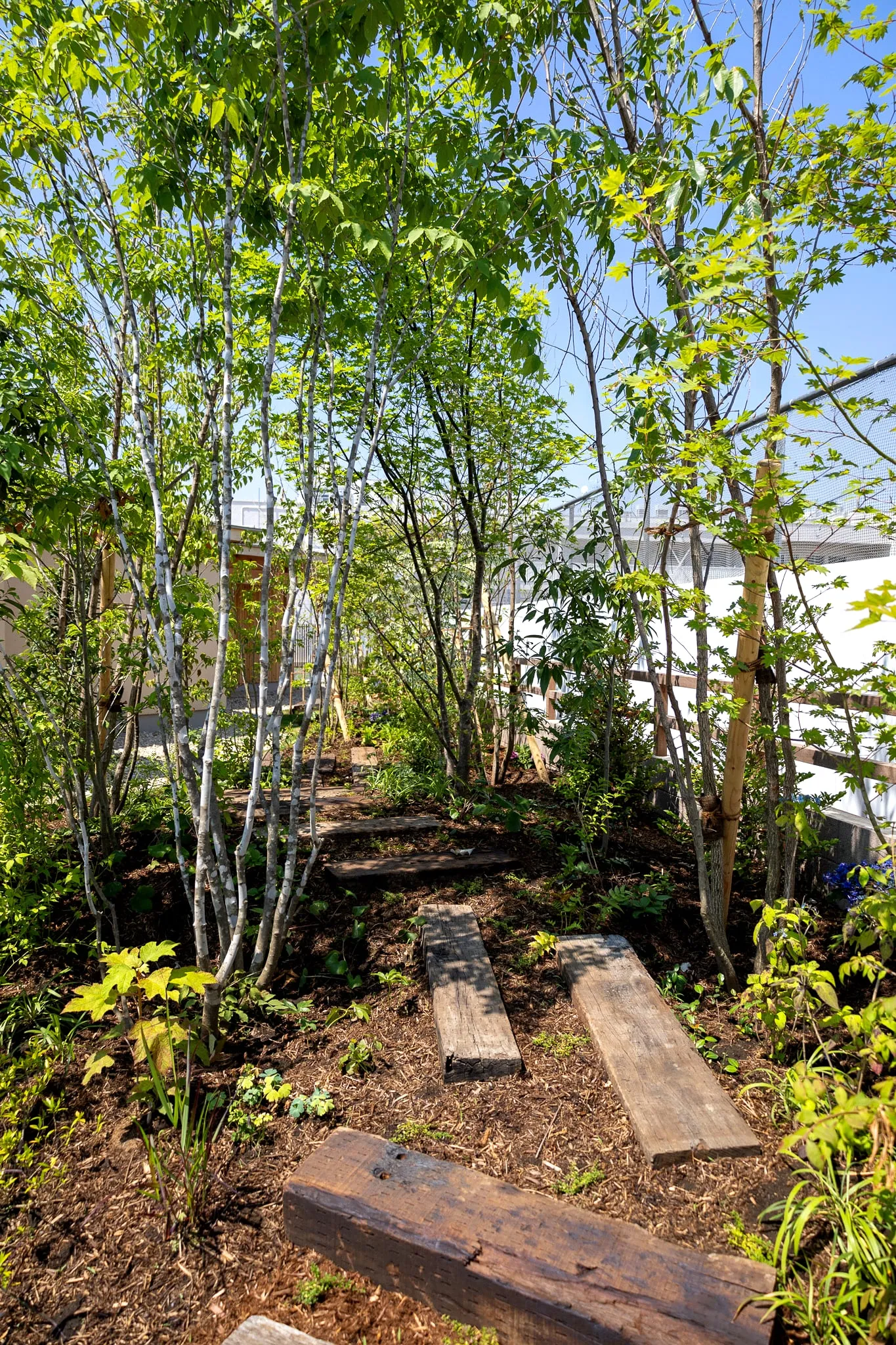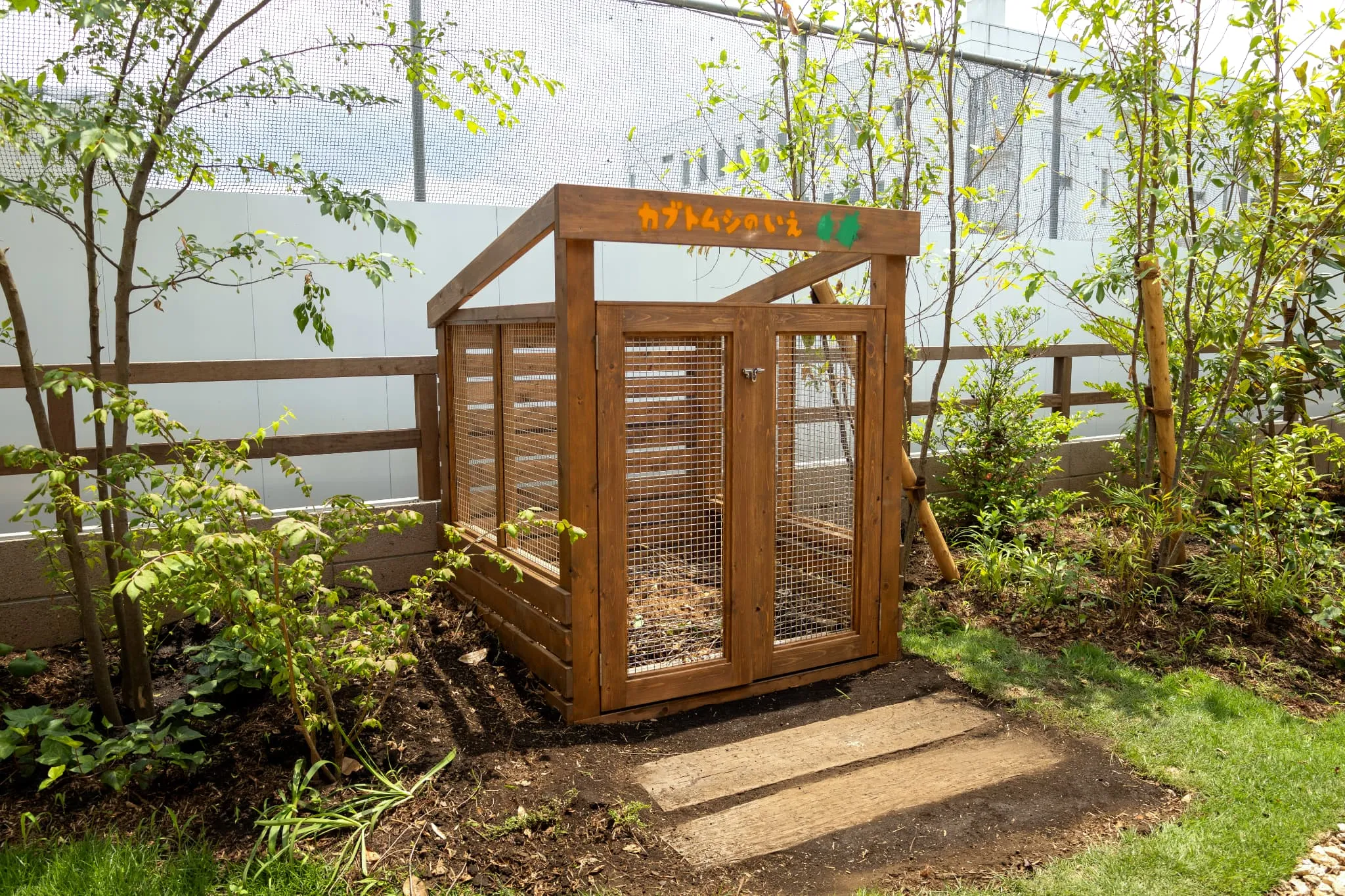 植栽計画においては、植物がみせる変化や成長を通して子供たちが自らの成長を感じることができるよう、多種の草花や香りのある花木、四季の変化が豊かな雑木などを用いて五感で感じられるようにしました。また在来種を中心とした構成にすることで地域の生態系の一部となり、子供たちの大好きな昆虫採りができる庭を目指しました。 特にカブトムシの飛来を願い、クヌギやシラカシを取り入れるともに、幼虫の棲み処となる落ち葉コンポストを設置しました。
